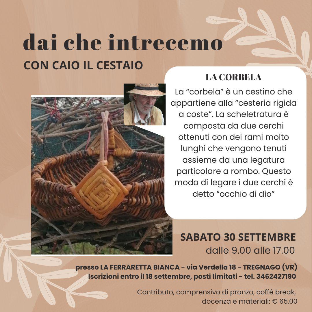 Basketry course held by GIOVANNI CLAUDIO ZUFFO, KNOWN AS CAIO THE BASKET MAKER, which includes the creation of THE CORBELA. The “corbela” is a basket that belongs to “rigid ribbed basketry.” The framework consists of two circles made from very long branches that are held together by a particular diamond-shaped binding. This way of binding the two circles is called “god’s eye”