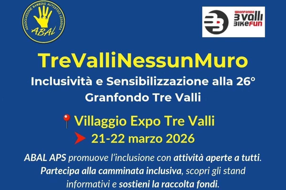 On Saturday, March 21, on the occasion of the Granfondo Tre Valli, participate in the inclusive 3 km walk, open to everyone and free of charge, with the support of guides.