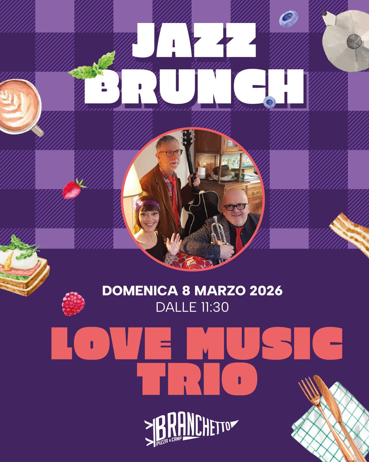Domenica 08 marzo 2026 dalle ore 11.30 al Branchetto Camping brunch con musica jazz insieme a LOVE MUSIC TRIO