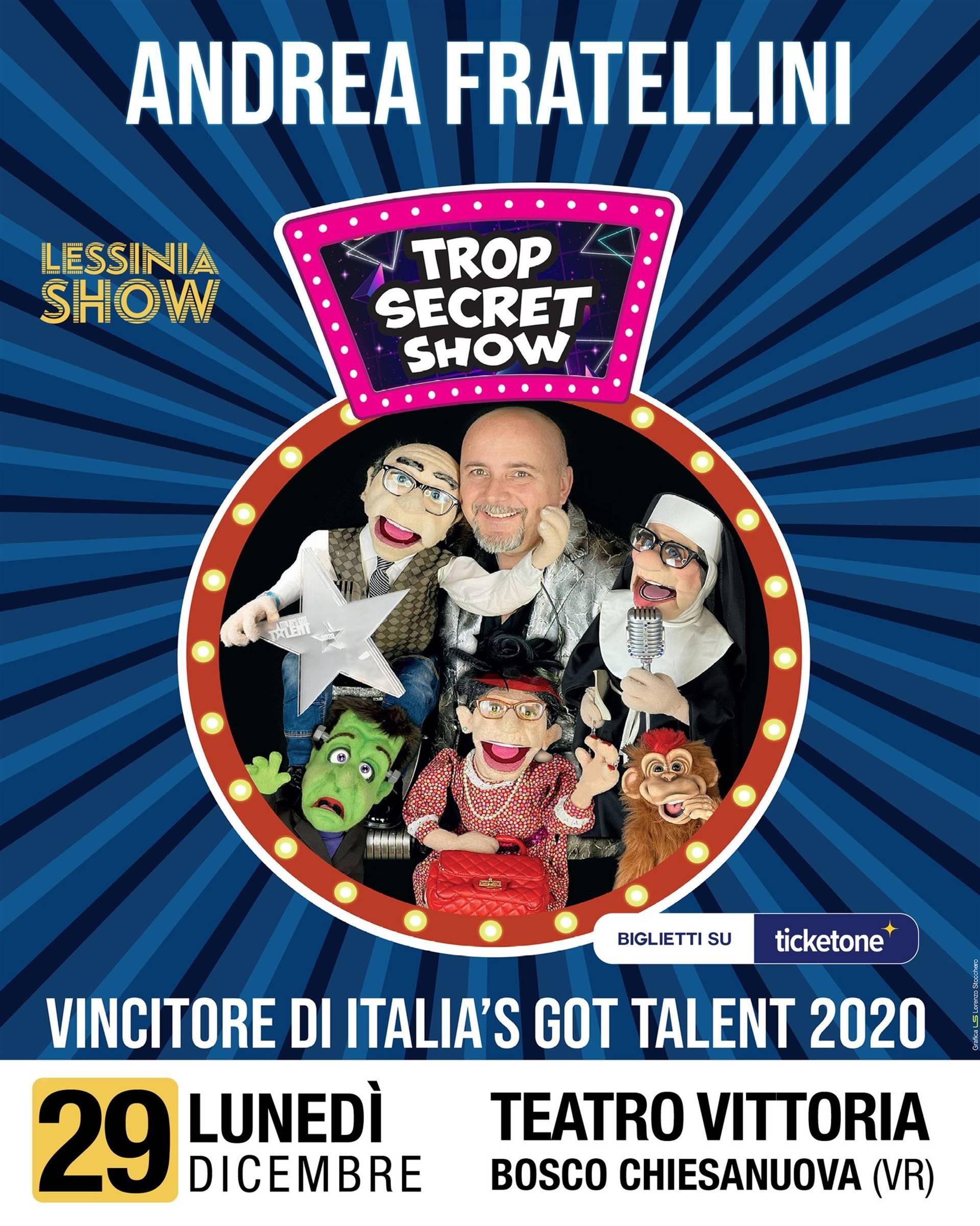 Il terzo ed ultimo appuntamento di Lessinia Show sarà Lunedì 29 dicembre 2025 alle ore 21.00 all'insegna del divertimento per tutta la famiglia! Direttamente da Italia's Got Talent arrivano a Bosco Chiesanuova Andrea Fratellini & Zio Tore con lo spettacolo Trop Secret Show! Andrea, ventriloquo, comico e prestigiatore, ci farà sorridere e cantare insieme al suo pupazzo Zio Tore e altri simpatici personaggi di propria invenzione. Adatto ad un pubblico di grandi e piccini, è un concentrato di risate, divertimento, musica e magia, uno show ricco di momenti di esilarante comicità attraverso effetti magici, gag comiche e canzoni cantate dal vivo attraverso l'arte della ventriloquia.